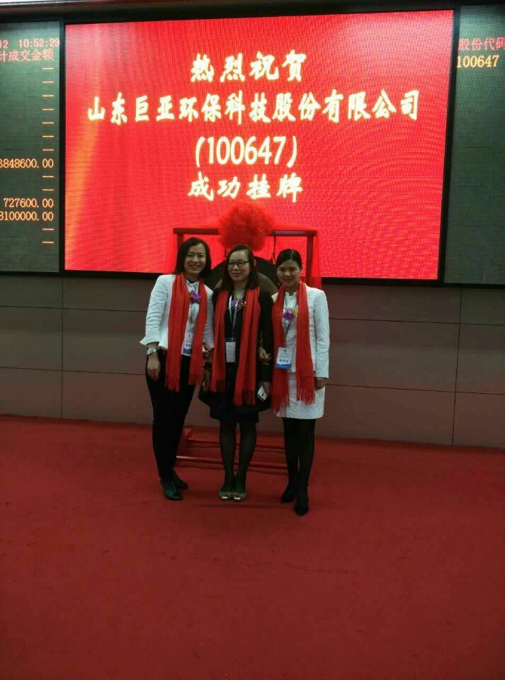 热烈庆祝我所服务的山东巨亚环保科技股份有限公司(股份代码:100647,股份简称:巨亚环保)取得上海股权托管交易中心2016年3月29日出具的《关于同意山东巨亚环保科技股份有限公司挂牌的通知 沪股交[2016]696号》,获准在上海股权托管交易中心挂牌上市。
