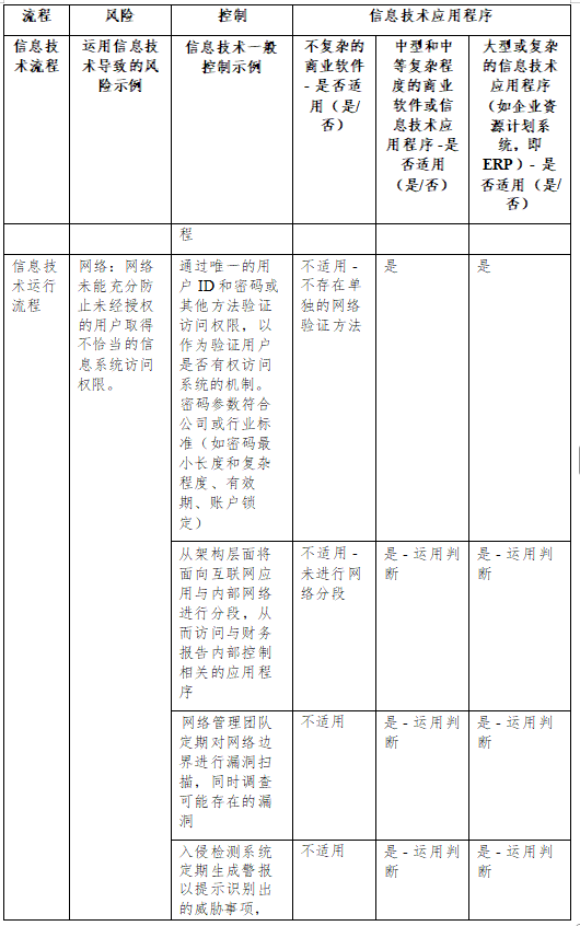 (3)操作系统。操作系统层面的信息技术一般控制通常应对与 管理访问权限相关的运用信息技术导致的风险。管理访问权限可能 导致其凌驾于其他控制之上,这包括破坏其他用户的账户,添加新 的未经授权的用户,加载恶意软件或执行脚本或其他未经授权的程 序等行为。