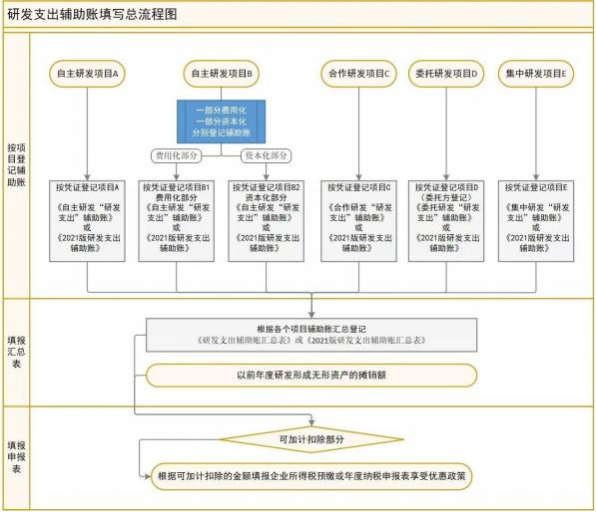 企业应根据研发支出辅助账,汇总填报辅助账汇总表。需注意的是, 研发支出辅助账汇总表应填报所属期间的费用化及已结束的资本化项目的 研发支出金额。具体核算流程可见下图: