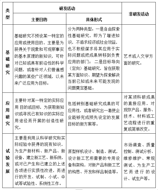 7.社会科学、艺术或人文学方面的研究。其中,1 至 6 类活动虽与研发活动有密切关系,但都不属于研发活动。